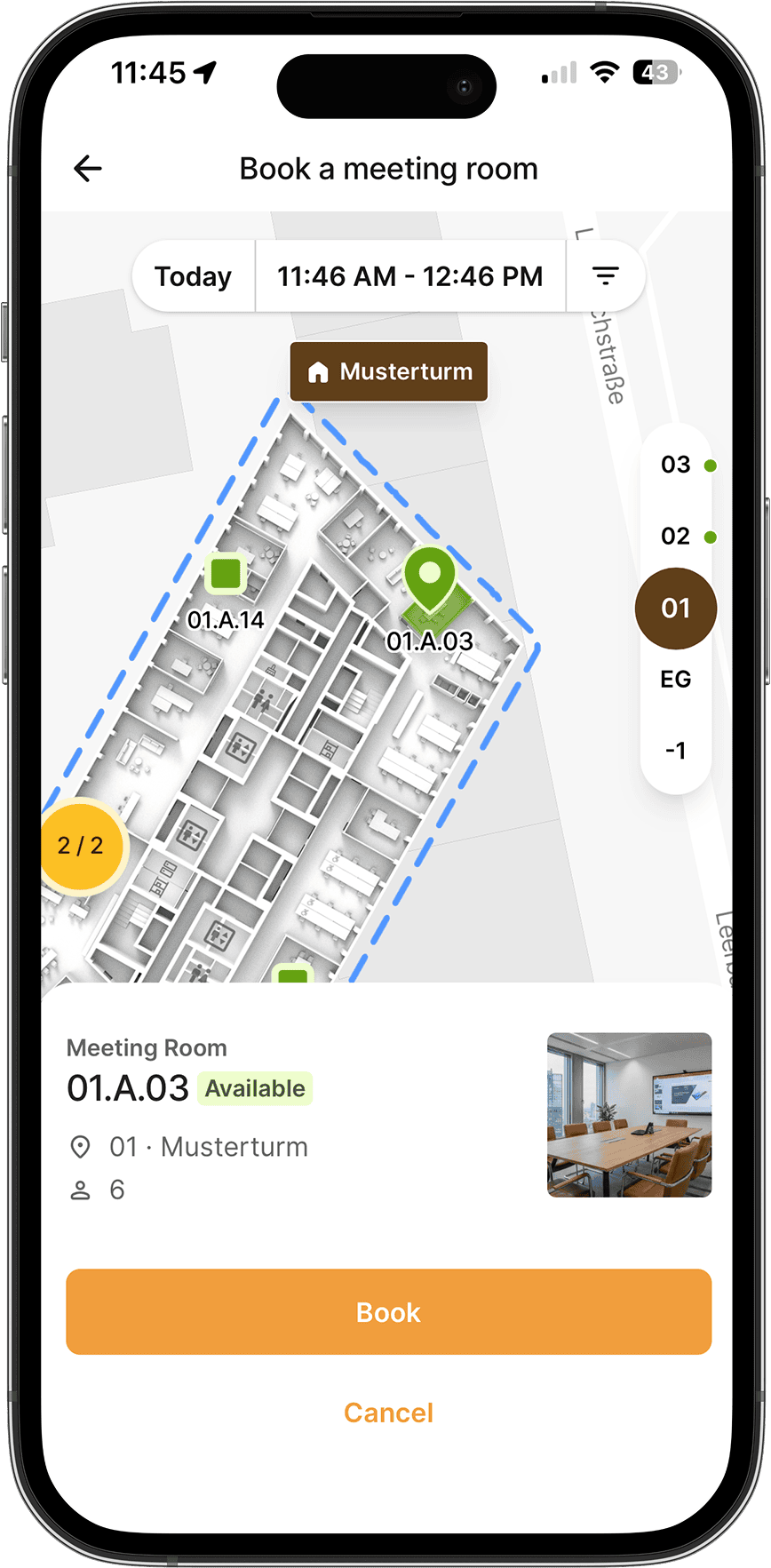 Our user-centered solution focuses on the user. Thanks to integration with Outlook, booking rooms, tables, loungers and parking spaces remains as simple as ever. Our user-friendly app enables spontaneous bookings even at peak times. Users benefit from self-service options and can flexibly adapt their workspaces to their tasks. Our system supports hybrid working models and offers security when booking workstations. Additional functions such as catering bookings, accessibility and the use of relevant sensor data increase employee efficiency and satisfaction. The app shows real-time availability and enables bookings across multiple platforms, including on-site kiosk screens.